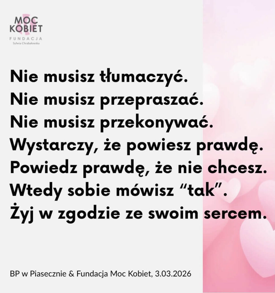 Tymi słowami zaczęłyśmy wieczór w Piasecznie. I wierzę w każde słowo z tego zdania. Myślę tylko, że moc kobiet, ich siła, bardzo często spoczywa ukryta gdzieś głęboko w naszej podświadomości. Leży przykryta latami mówienia „przepraszam”, latami tłumaczenia swoich decyzji i latami stawiania wszystkich przed sobą. Kobiety z racji swojej biologii i pełnionych funkcji społecznych z czasem zapominają, że są ważne. Często dopiero dorastające i buntujące się dzieci przypominają ich matkom, że „ja też jestem ważna”.